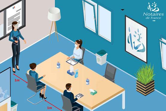 Avant votre rdv, le notaire vous rappellera toutes les mesures de protection et le protocole mis en place dans son office. N'hésitez pas à demander si votre notaire est équipé de la visioconférence, vous pourrez alors être dispensés de tout déplacement.
